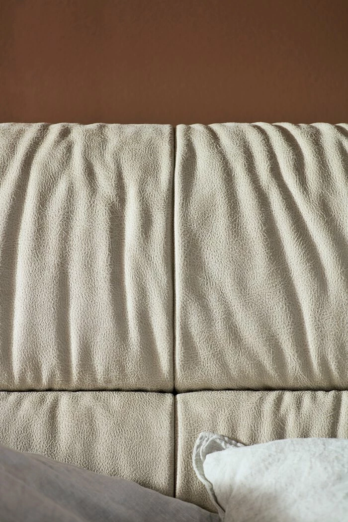 - Gestell und Kopfteil aus Sperrholz mit Lederoptikbezug in beige