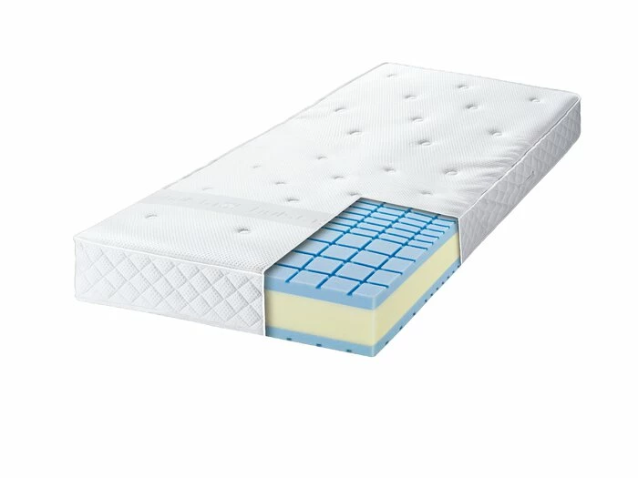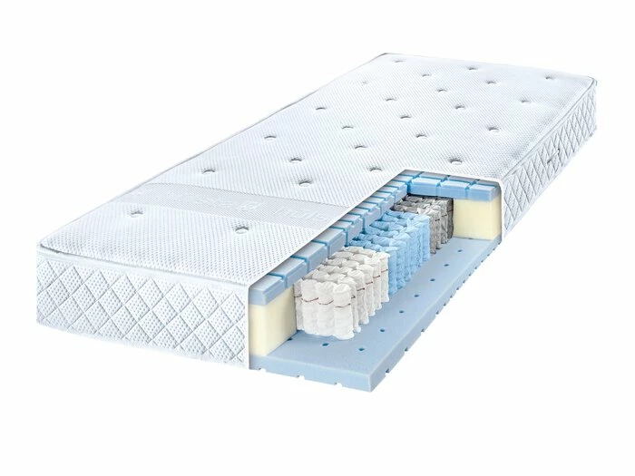 - 7-Zonen-Aufbau mit Tonnentaschenfederkern und Microfeder für optimale Körper- und Wirbelsäulenunterstützung, oben mit 4 cm hoher HR-Kaltschaum-Abdeckung mit Mehrzonen-Schnitt und Luftkanälen für sehr hohe Rückstellkraft